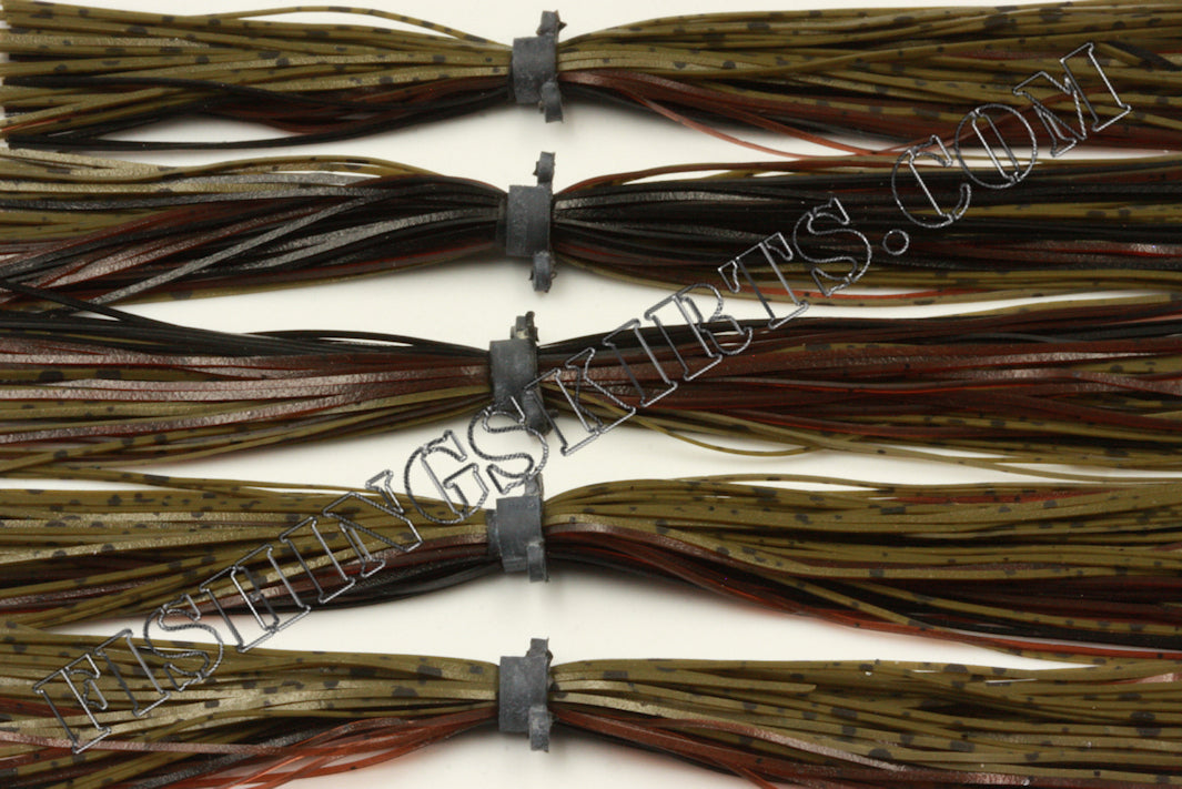 BOSS banded skirts, black, brown, and green pumpkin dalmatian, 55 strands per skirt, sold as 5pk. These BOSS banded replacement skirts are made of 100% super responsive silicone for an unmatched action, and some of the most eye and fish catching colors and patterns ever seen.