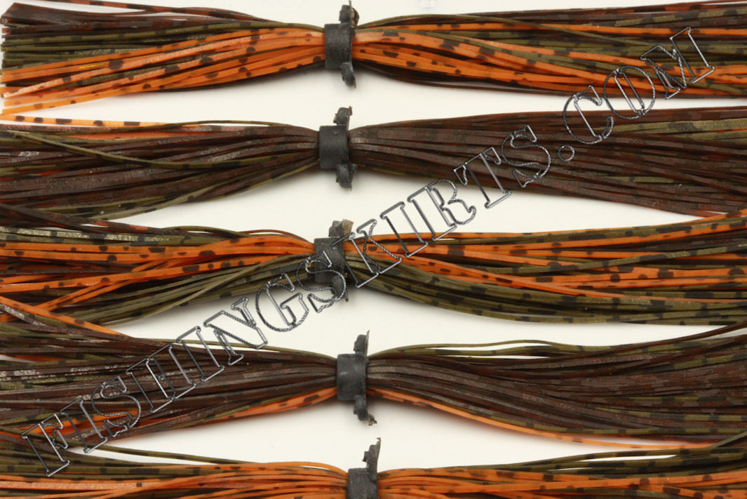 BOSS banded skirts, Green Pumpkin Barbed Wire, Brown Brown Barbed Wire, & Burnt Orange Dalmatian, 55 strands per skirt, sold as 5pk.??These BOSS banded replacement skirts are made of 100% super responsive silicone for an unmatched action, and some of the most eye and fish catching colors and patterns ever seen.