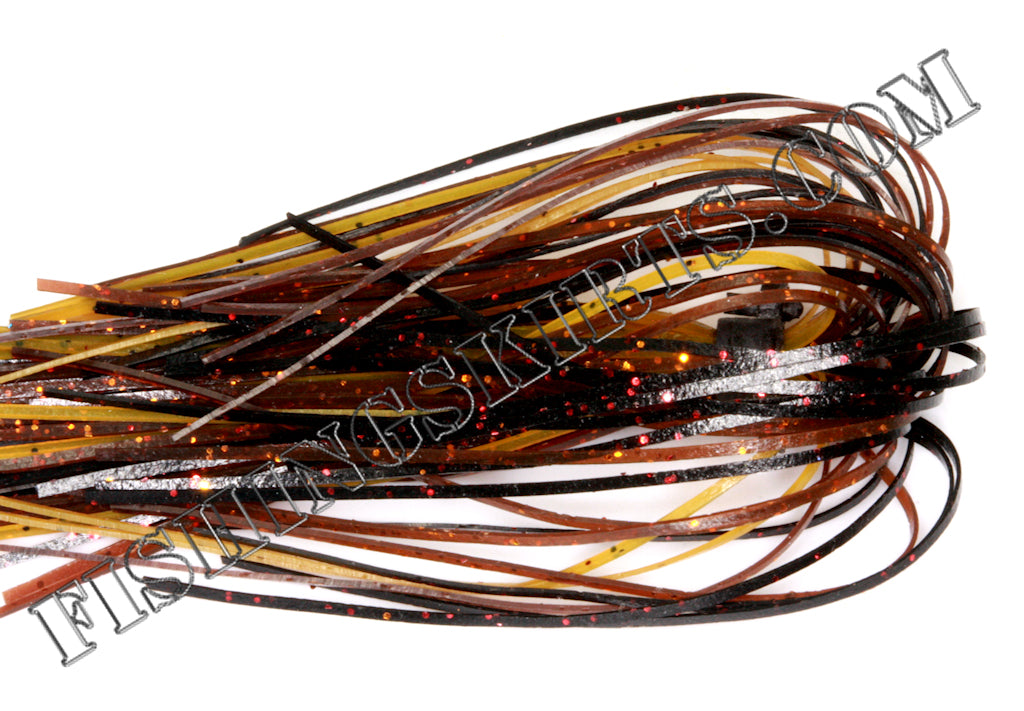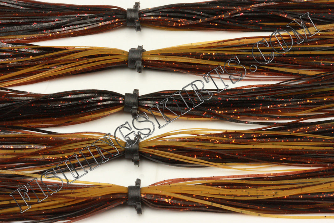 BOSS banded skirts, 5 pack of 55 strand 100% silicone skirts with rattle band in black with red glitter, brown with copper glitter, and amber pumpkin black flake. ?These BOSS banded replacement skirts are made of 100% super responsive silicone for an unmatched action, and some of the most eye and fish catching colors and patterns ever seen.