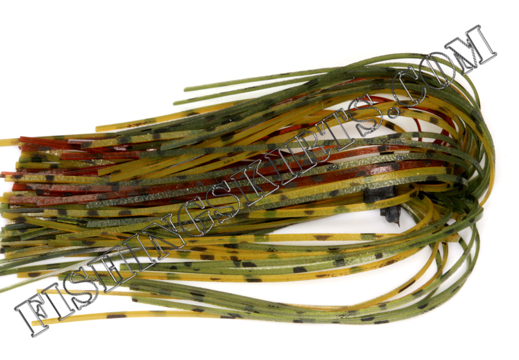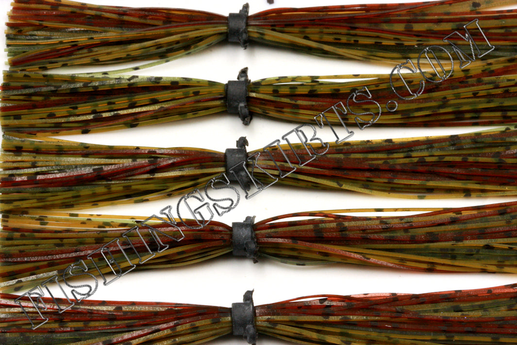 BOSS banded skirts, 5 pack of 55 strand 100% silicone skirts with rattle band in whiskey, rust, and watermelon dalmatian. These BOSS banded replacement skirts are made of 100% super responsive silicone for an unmatched action, and some of the most eye and fish catching colors and patterns ever seen.