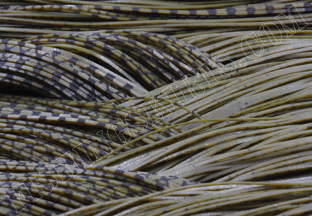This is a really pretty green pumpkin pepper tab (148) we produced with one of the sides having a black fish scale print. The idea behind the one-side-print is not to darken the tab so much which also allows the green pumpkin color to stand out more in your skirt build. 22 strands per tab. 10 tabs per pack.
